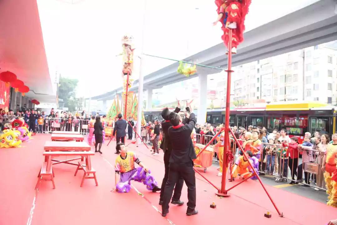锣声招八面威风,敲响中港豪情!在热闹的欢呼声中,瑞狮苏醒,昂首一声威,迎新年福气,纳八方财气!九头瑞狮昂首腾空,盘旋交错,好一个气势磅礴、喜气洋洋!掀开了岭南特色的开市醒狮表演的序幕。